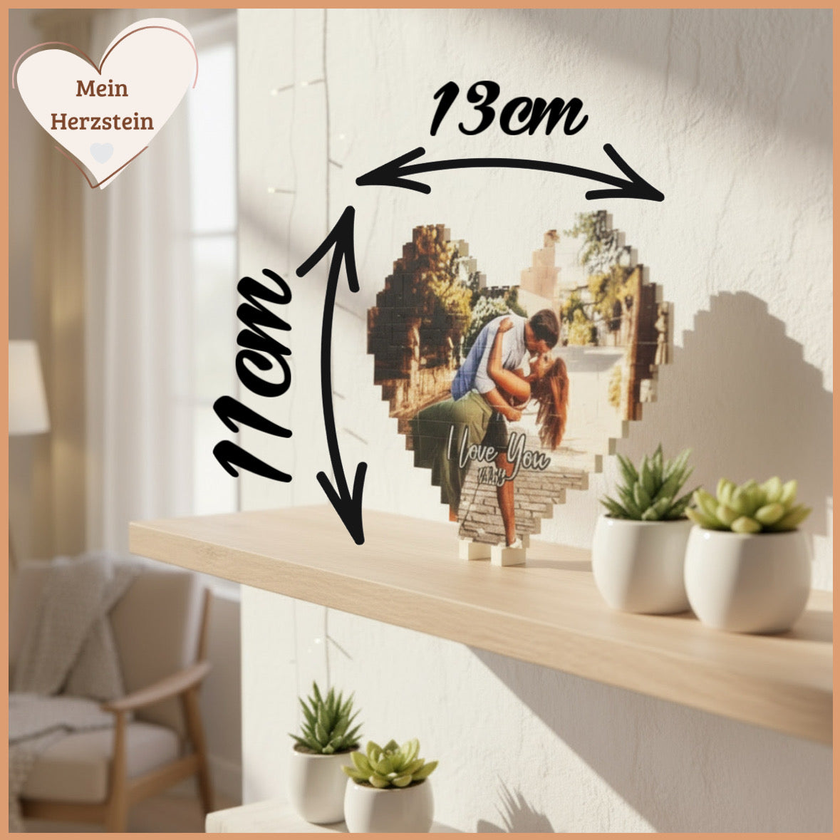 Mit 11cm Höhe und 13cm Breite ist euer Herzstein kompakt genug, um auf jedes Regal, Sideboard oder Nachttisch zu passen - und trotzdem groß genug, um eure Liebe sichtbar zu machen. Ob im Wohnzimmer, im Kinderzimmer, oder auf dem Schreibtisch: Dieses kleine Herz voller Erinnerungen findet immer seinen Platz und bringt eure Familienmomente zum Strahlen.